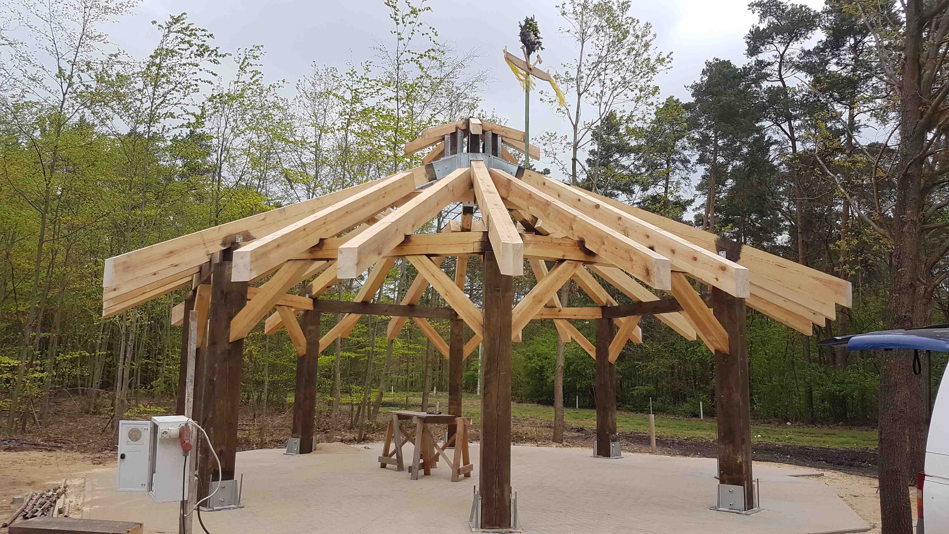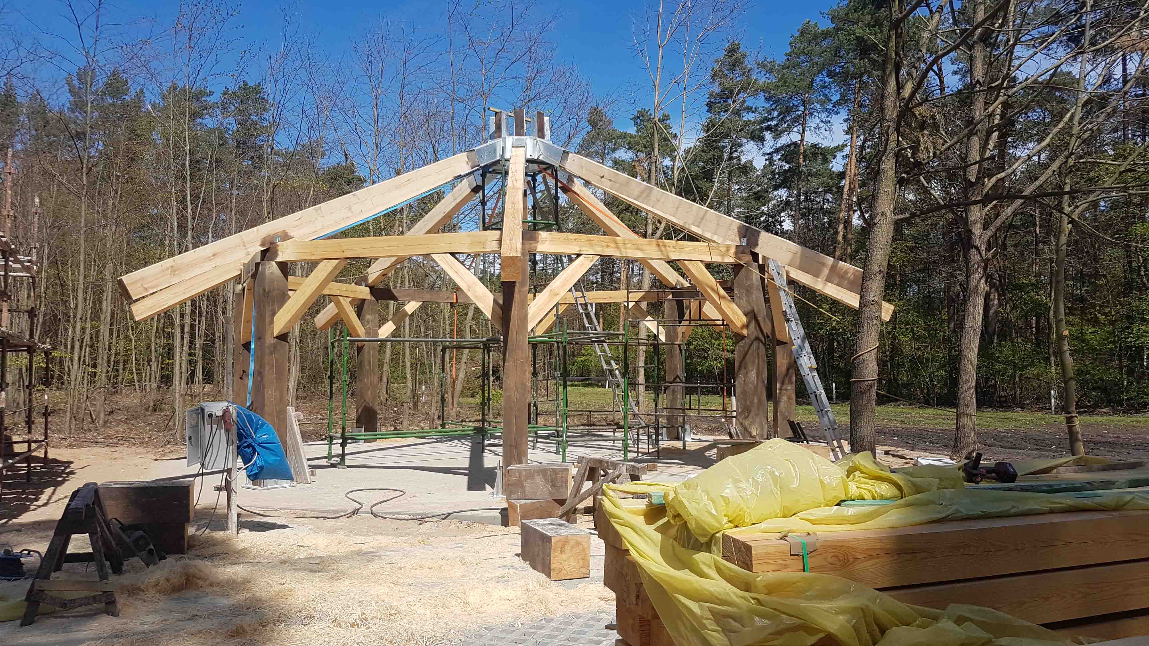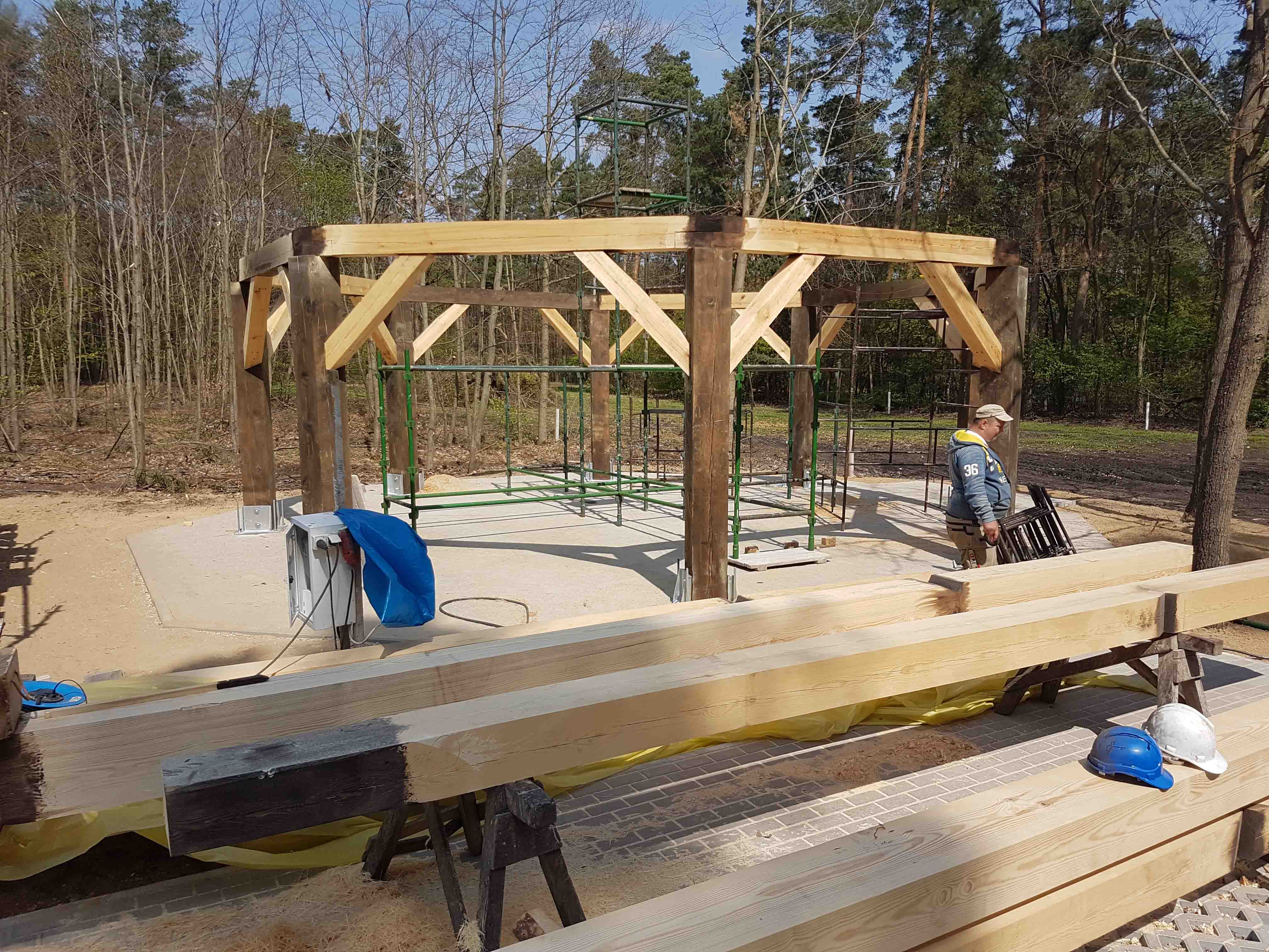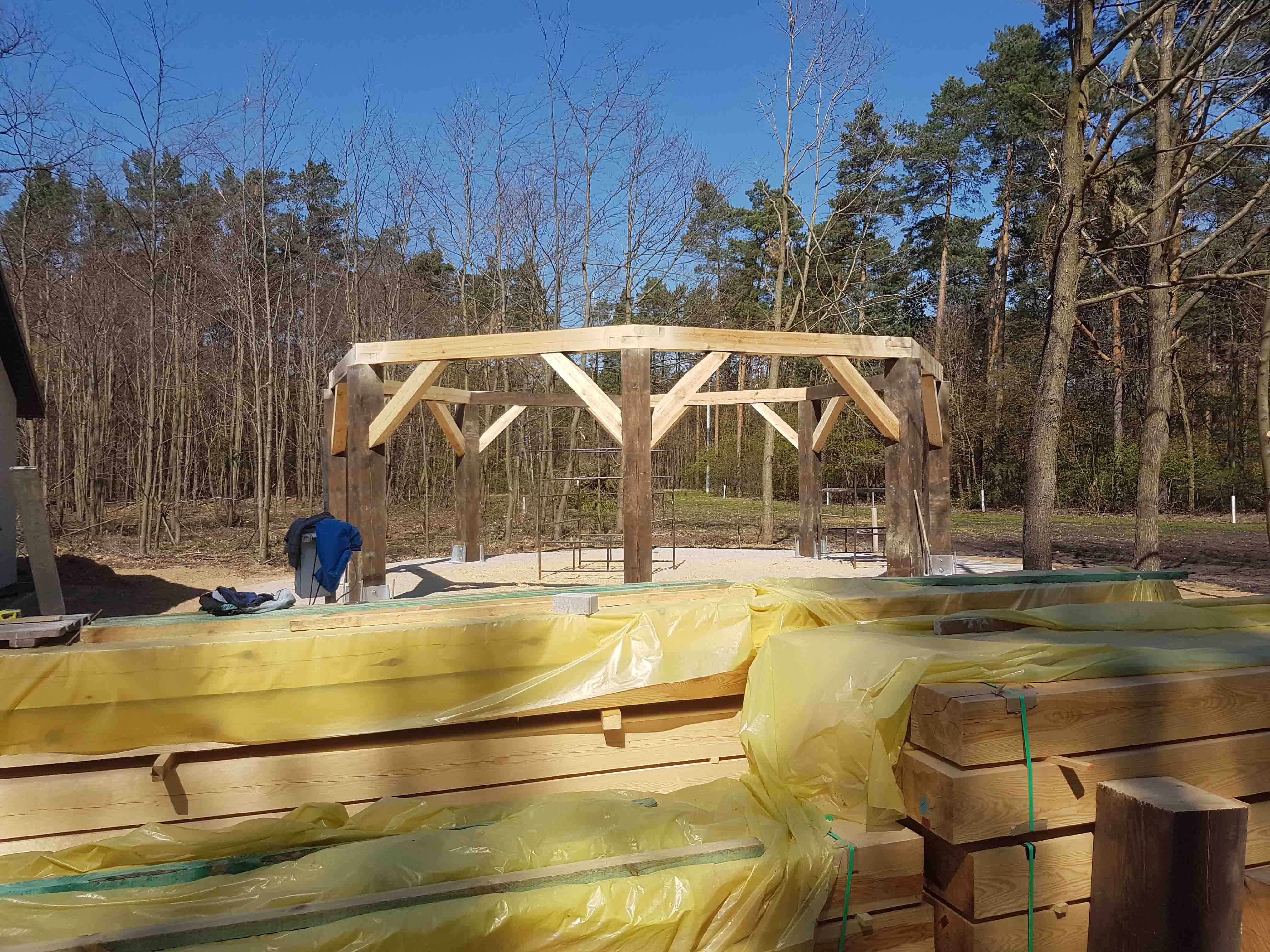 Altana o średnicy 12 m. u podstawy. Przekrój słupów 30x30 cm, przekrój krokwi 20x28 cm. Kolosalna altana, nie da się przejść obok niej obojętnie. Dzięki takiej masywności posłuży na wiele, wiele lat biesiad Szkółce Leśnej.