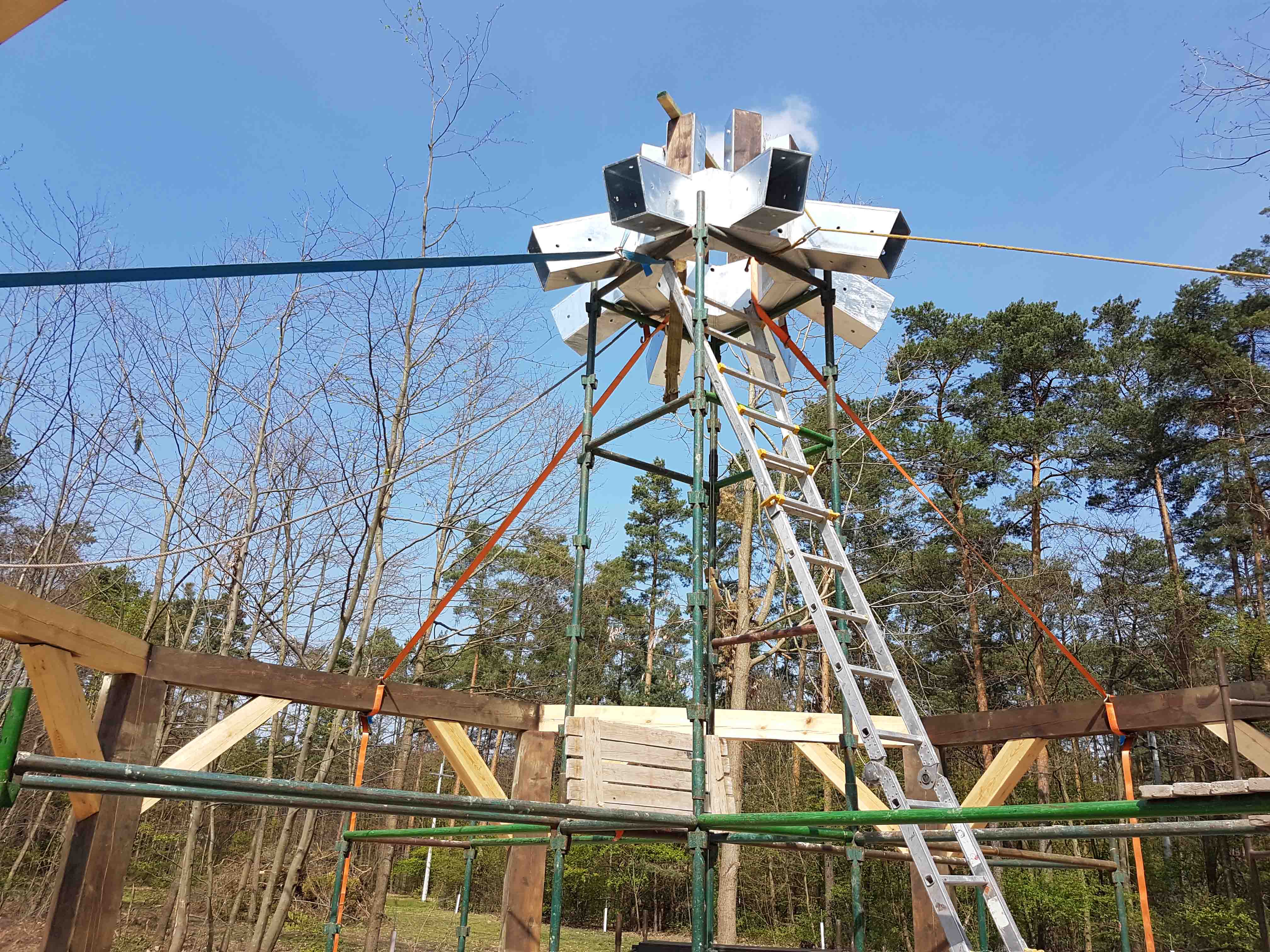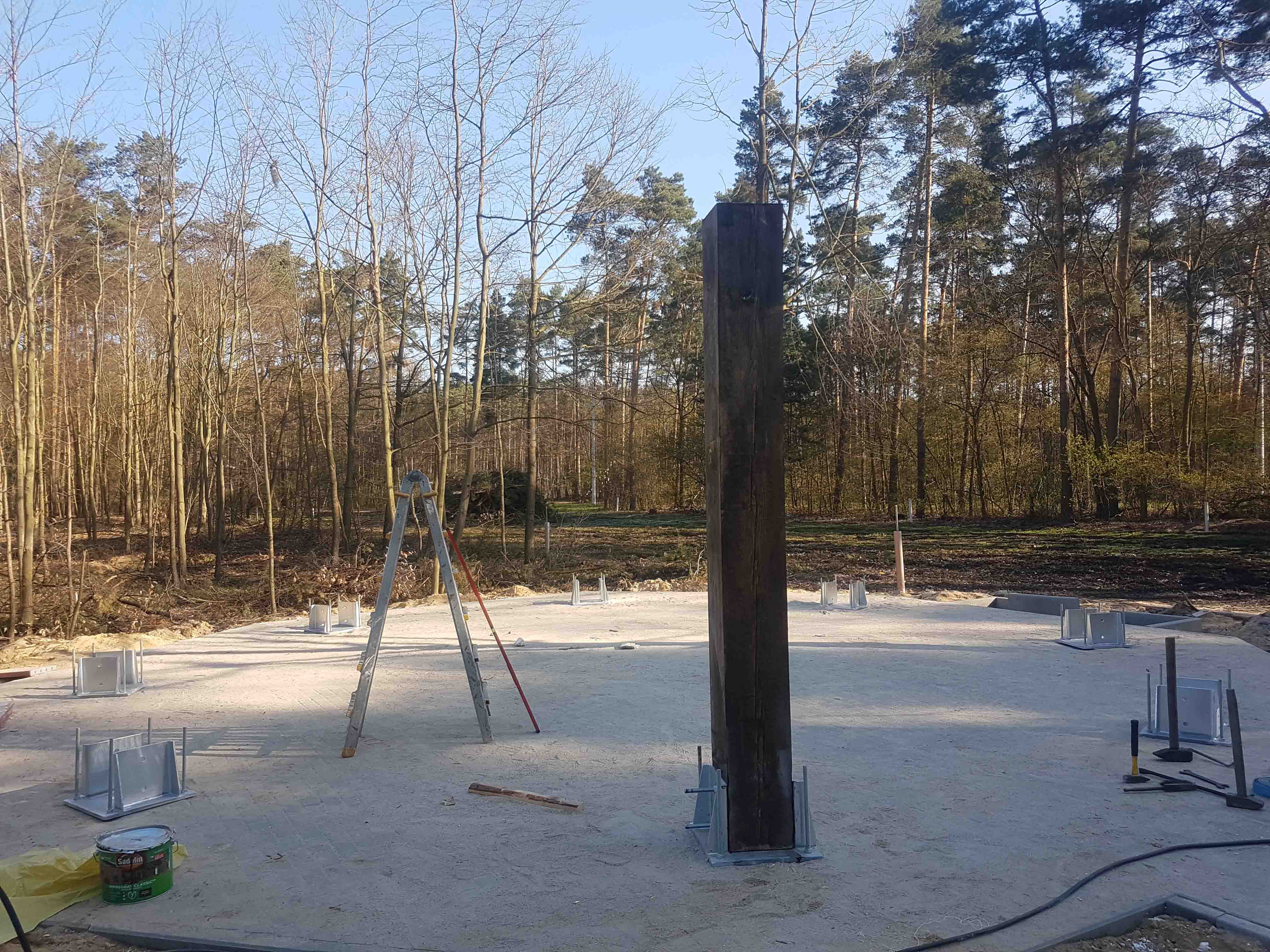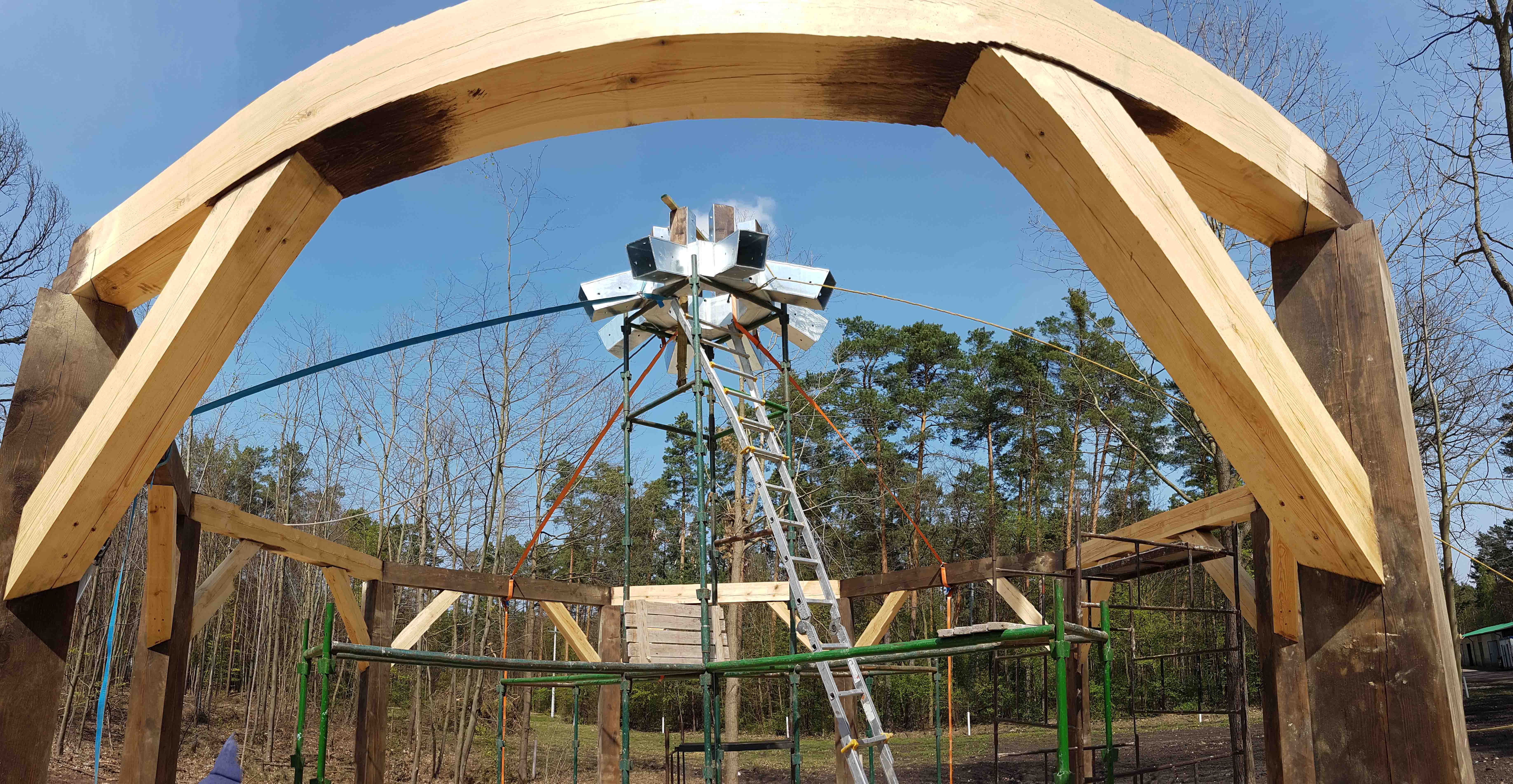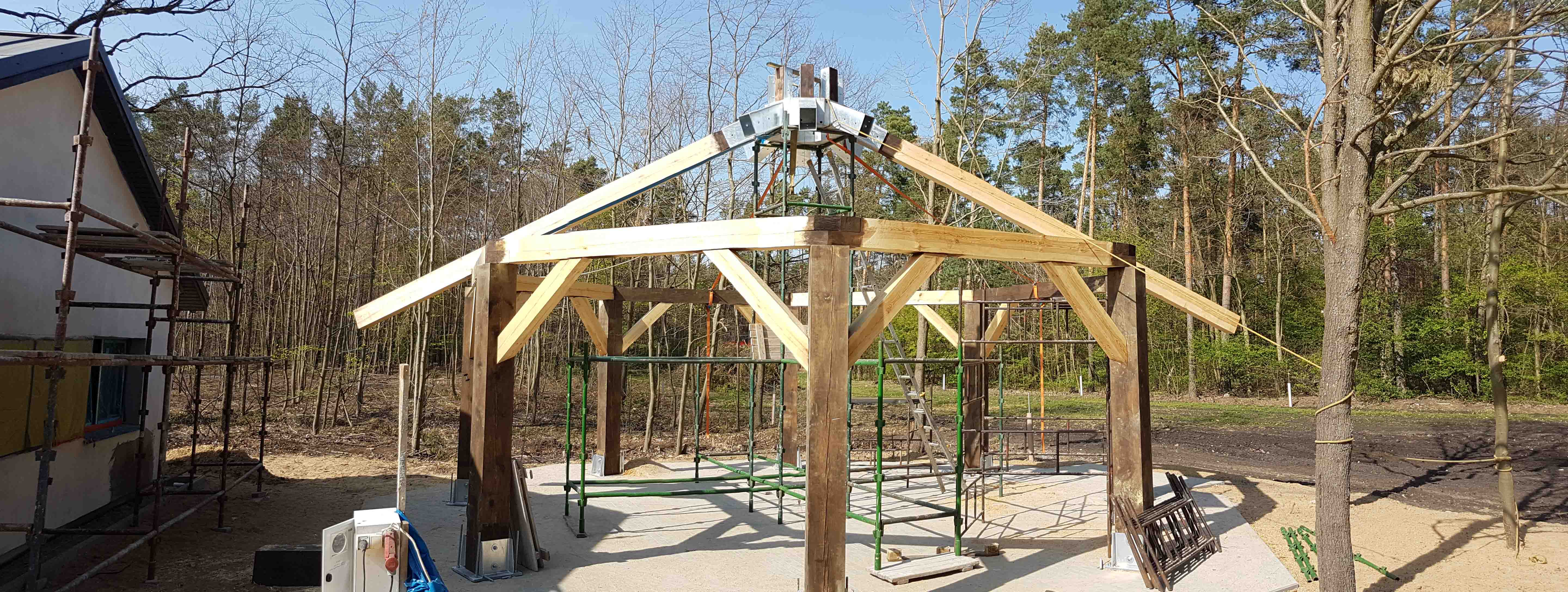 Altana o średnicy 12 m. u podstawy. Przekrój słupów 30x30 cm, przekrój krokwi 20x28 cm. Kolosalna altana, nie da się przejść obok niej obojętnie. Dzięki takiej masywności posłuży na wiele, wiele lat biesiad Szkółce Leśnej.