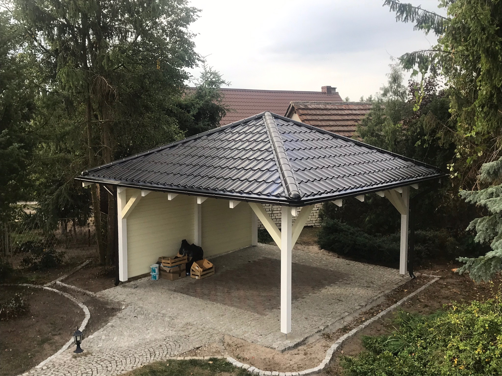 Śnieżno biała altana z czarnym kopertowym dachem